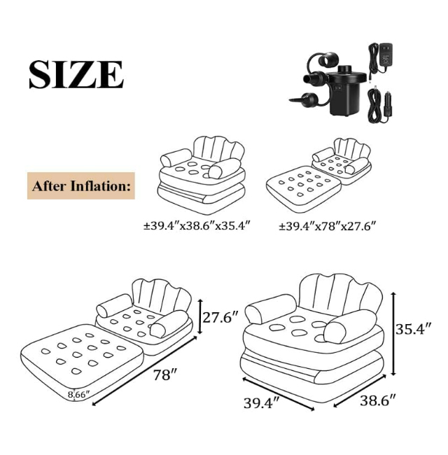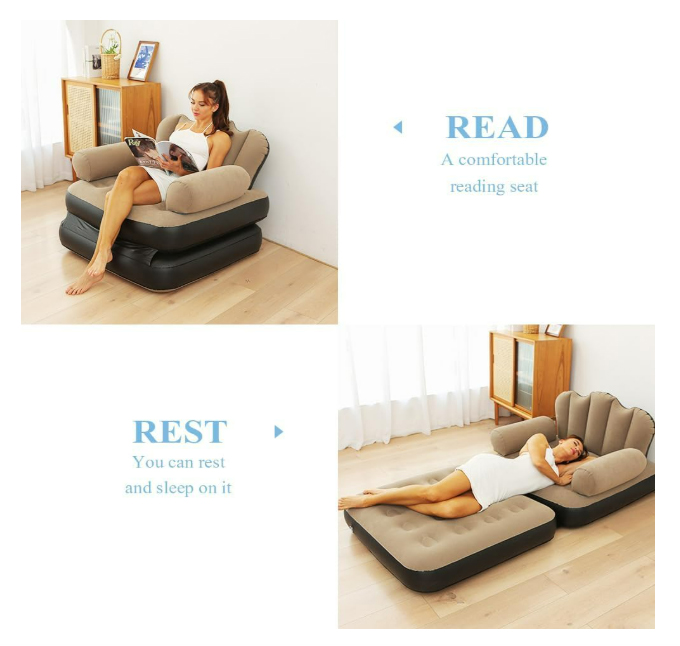 COMPACT AND PORTABLE: This inflatable sofa offers the convenience of compact storage and portability. Once deflated, it folds into a small size, making it effortless to store and carry. Ideal for those with limited living space or for outdoor activities, it occupies minimal space when not in use.